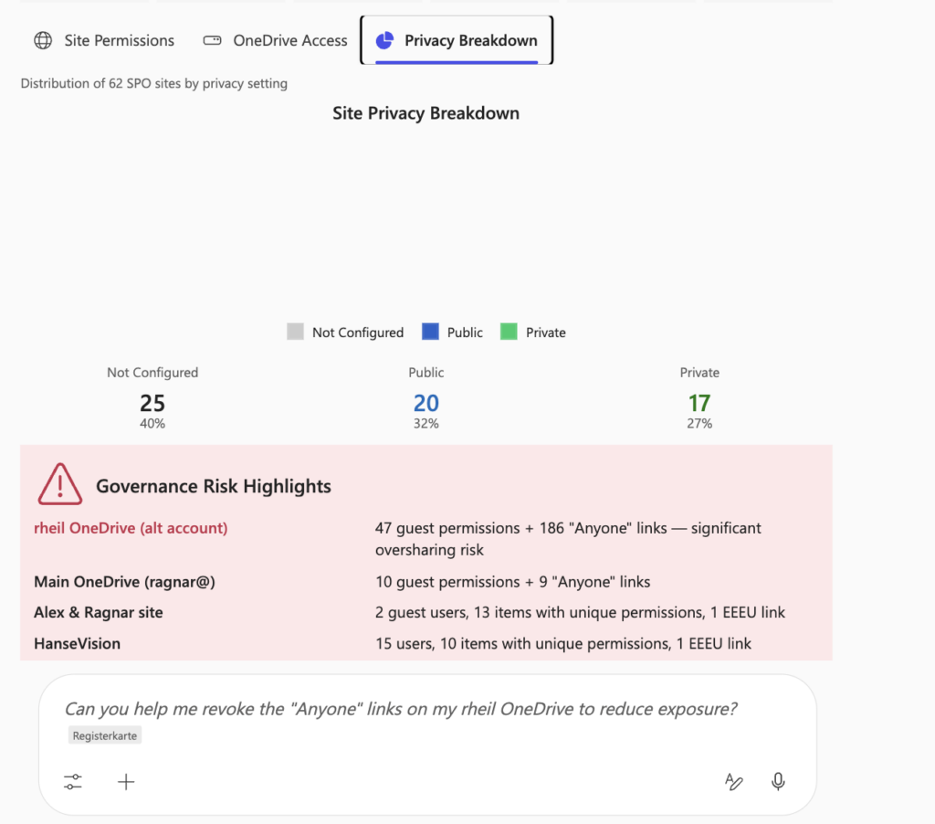 Using the example of my tenant with 61 SPO sites and 3 OneDrive accounts, Cowork provides three critical insights immediately: